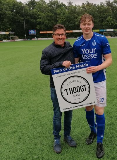 Niels Kuus had zondag een basisplaats in de verdediging van SO Soest 1 en de aanvoerder van de O23 speelde daar een prima wedstrijd. De laatste diner/lunchbon van Restaurant 't Hoogt werd door juryvoorzitter Harry Janmaat dan ook aan de jonge verdediger uitgereikt.