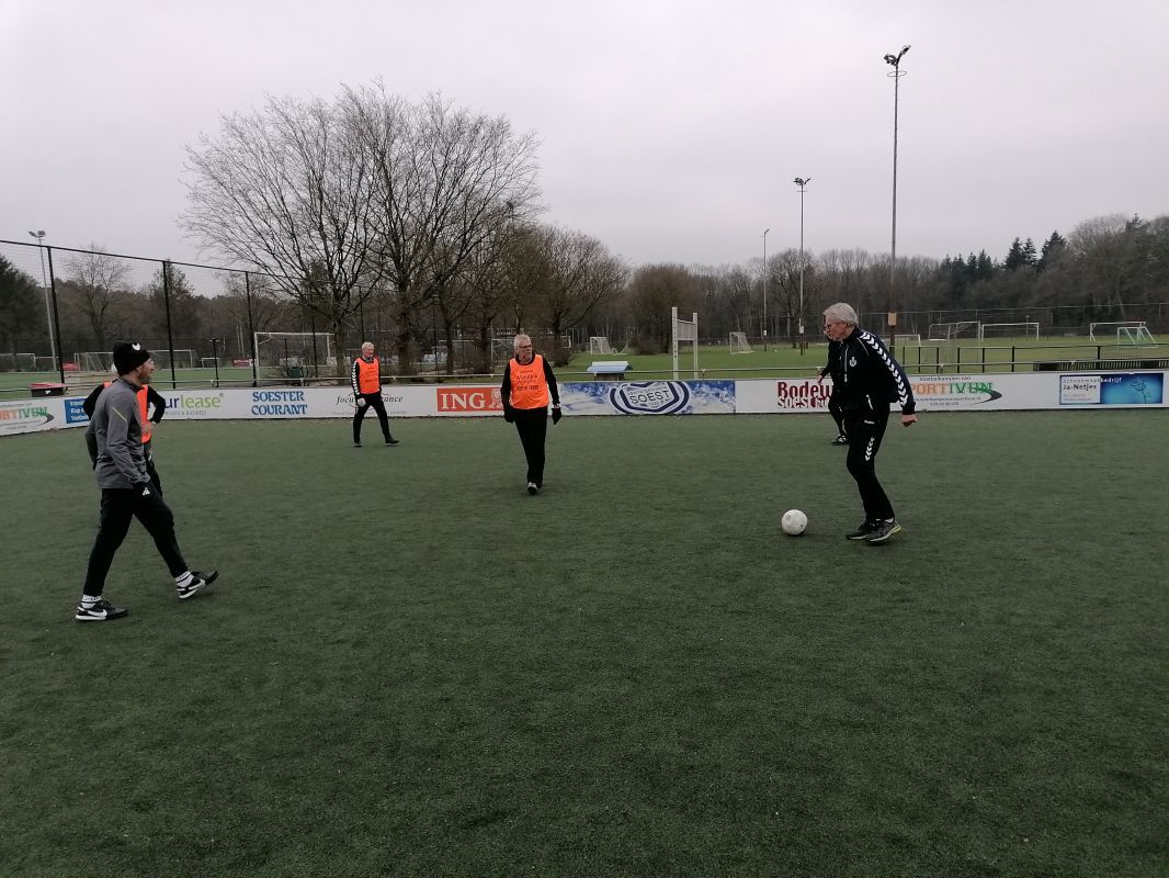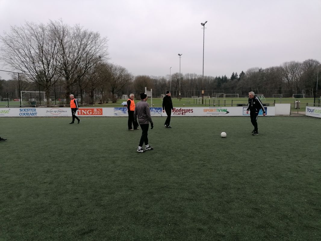 Het is koud en guur op een dinsdagmiddag die de kleur heeft van een komo-zak. Maar de acht wandelvoetballers van SO Soest hebben geen oog voor de grauwe kleur van deze dag en de kou laat ze ook onberoerd. De sportievelingen, zeven man en één vrouw, zijn vooral bezig met die bal. Het leren monster gaat van voet tot voet, en de voetballers maken goed gebruik van de boarding. Zo schiet het spel, ondanks de gevorderde leeftijd van de deelnemers, heen en weer en wordt er naar hartelust gescoord.