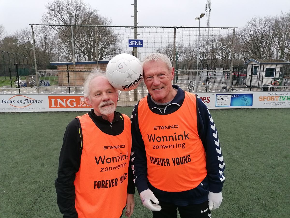 De eerder genoemde Piet (op bovenstaande foto links) en SO Soest-veteraan Henk van Loenen (70) hijgen even na en willen de verslaggever wel uitleggen wat er vooral leuk is aan het wandelvoetbal.