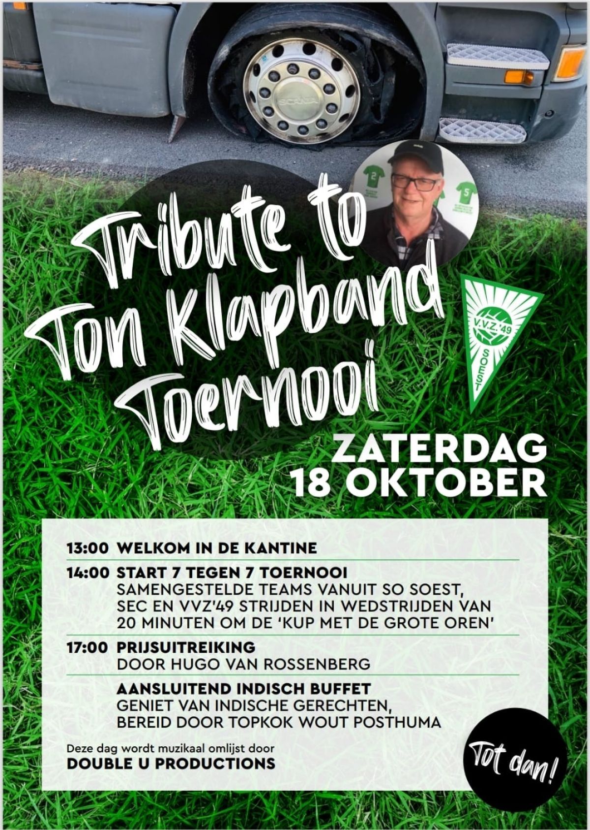 Zaterdag 18 oktober (inhaalweekend) wordt ter ere van Ton Klapband een Tribute Toernooi gehouden bij VVZ '49. Teams van SO Soest, VVZ en SEC strijden in wedstrijden van twintig minuten om de Kup met de Grote Oren. Na afloop is er een Indisch buffet, klaargemaakt door Wout Posthuma, ook bekend bij SO Soest.