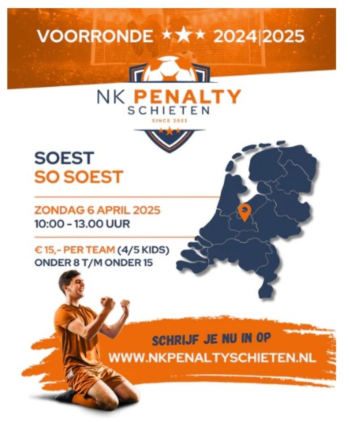 Op zondag 6 april 2025 wordt de voorronde van het NK Penaltyschieten 2024-2025 bij SO Soest gehouden. Dit spectaculaire evenement vindt plaats op onze eigen velden en biedt een geweldige kans voor zowel fanatieke voetballers als recreatieve spelers om hun penaltyskills te laten zien. Of je nu uit bent op de winst of gewoon een sportieve dag wilt beleven, iedereen is welkom om deel te nemen!