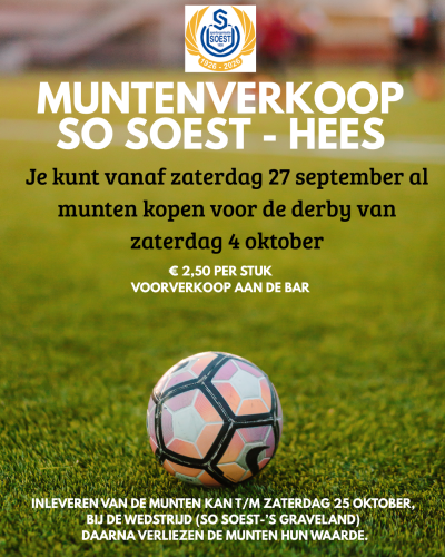 Vanaf zaterdag 27 september start de voorverkoop van munten. Deze munten kosten €2,50 per stuk en zijn te gebruiken tijdens de wedstrijd SO Soest – Hees én in de weken daarna. Voorkom lange wachtrijen en haal je munten alvast vooraf!