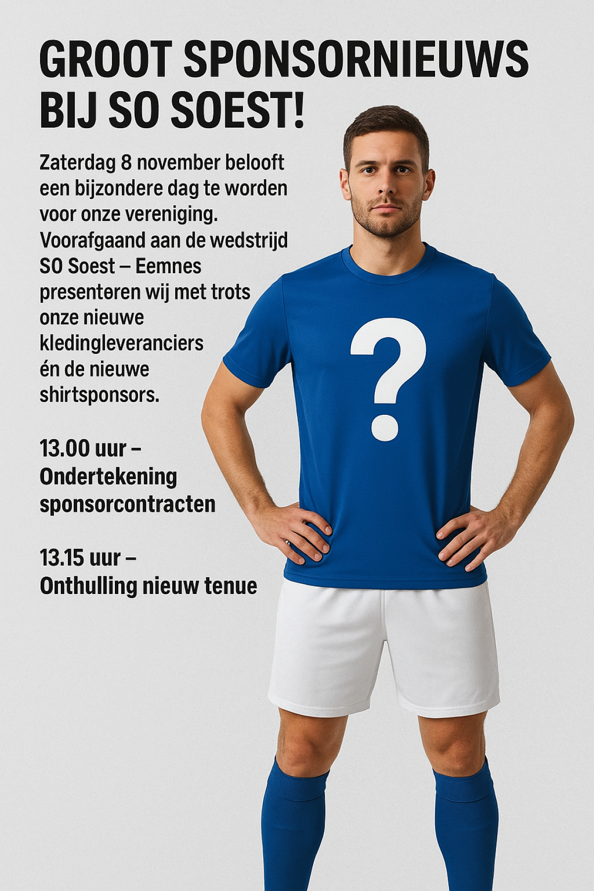 Zaterdag 8 november worden, voorafgaand aan de wedstrijd SO Soest – Eemnes, de nieuwe kledingleveranciers én de shirtsponsors voor het seizoen 2026/2027 gepresenteerd.