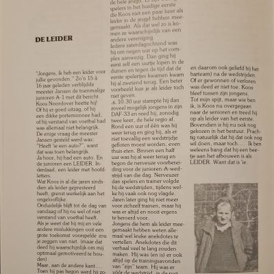 Zo was hij jarenlang leider van het hoogste juniorenteam, begeleider bij het eerste elftal, maar ook leider van de A3, het team van zijn zoon Jos – een team dat precies dertien spelers telde, maar waarin de sfeer en het plezier groot waren. In dat elftal maakte ik persoonlijk kennis met Koos. Samen met Willem “Meelbal” Hilhorst vormde hij een hecht leidersduo. Koos was fanatiek, had een goed gevoel voor humor en wist met een vrolijke kwinkslag iedereen scherp en met plezier het veld in te sturen.