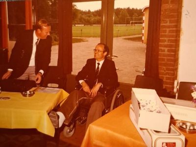 Bestuursleden Anton Snijders (links) en Cees Verkerk voorafgaand aan de kampioensreceptie van 1981 (SO Soest werd dat jaar kampioen van de vierde klasse KNVB). De oude kantine was toen nog niet zo oud en de toegang richting hoofdveld was nog intact. Bovendien stonden de asbakken nog op tafel.