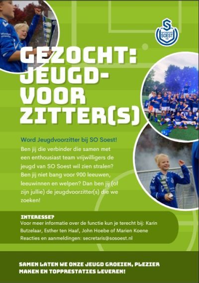 SO Soest is een bruisende en jeugdige vereniging. Want met meer dan negenhonderd jeugdleden, betrokken ouders en een grote groep enthousiaste vrijwilligers is onze jeugdafdeling het kloppende hart van de club. Om al die energie in goede banen te leiden, zoeken we jeugdvoorzitter(s) (m/v) die het leuk vindt/vinden om leiding te geven aan onze jeugdafdeling.