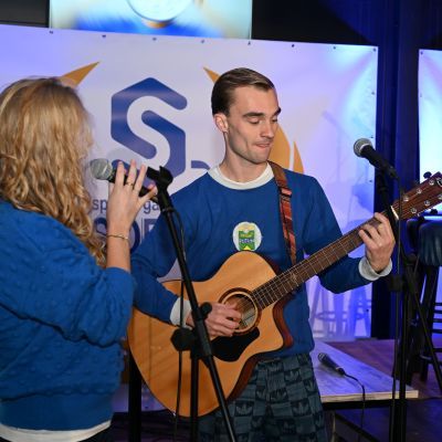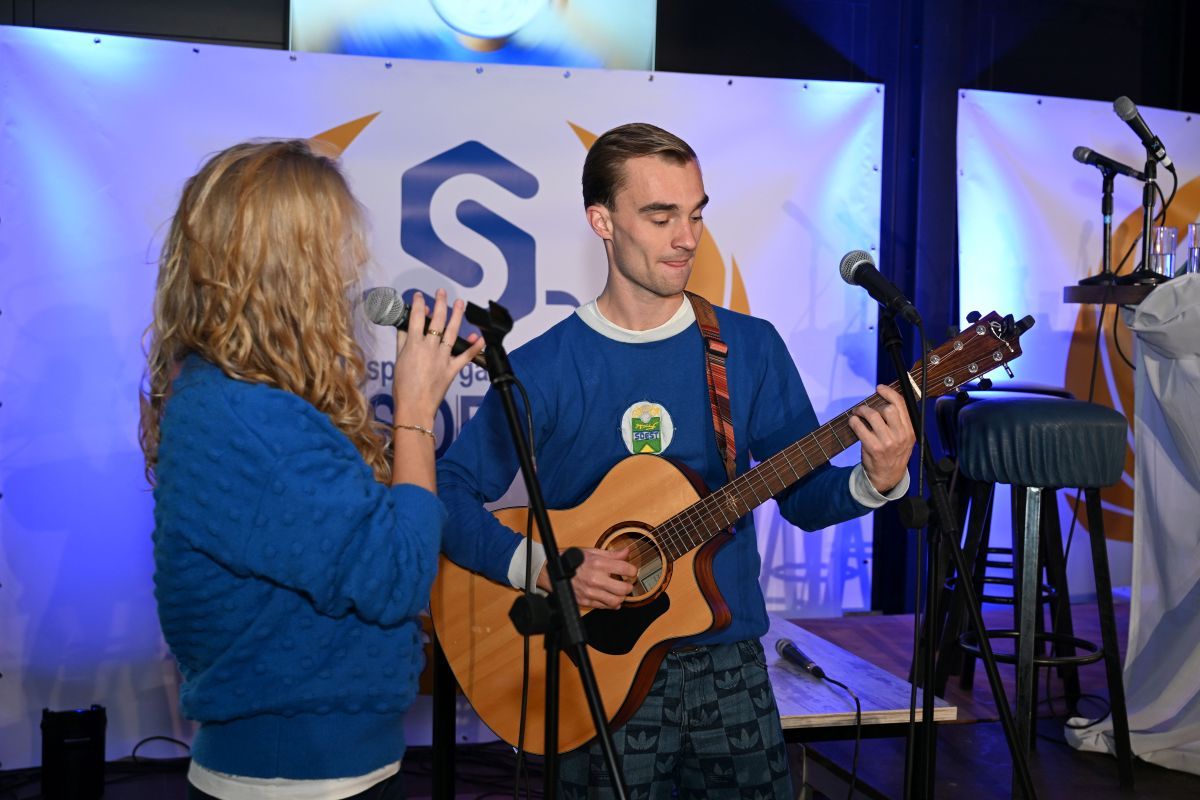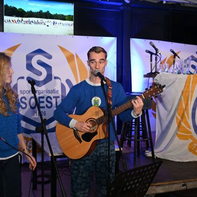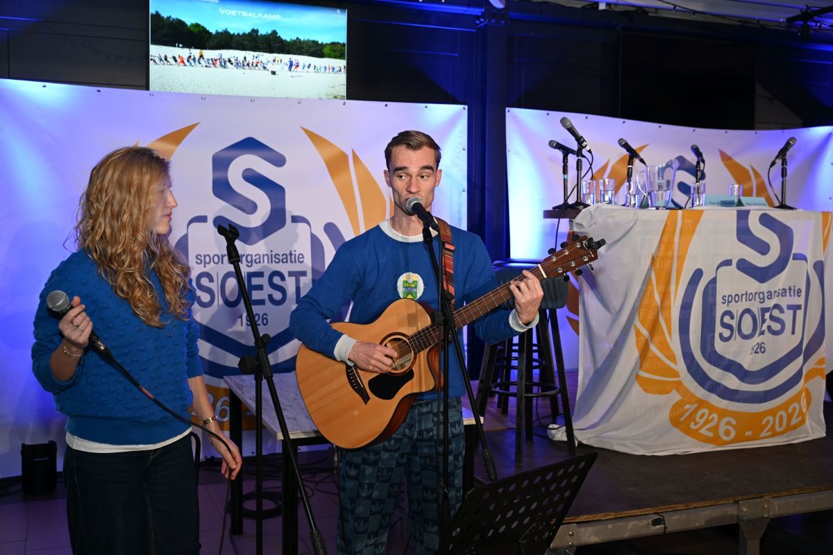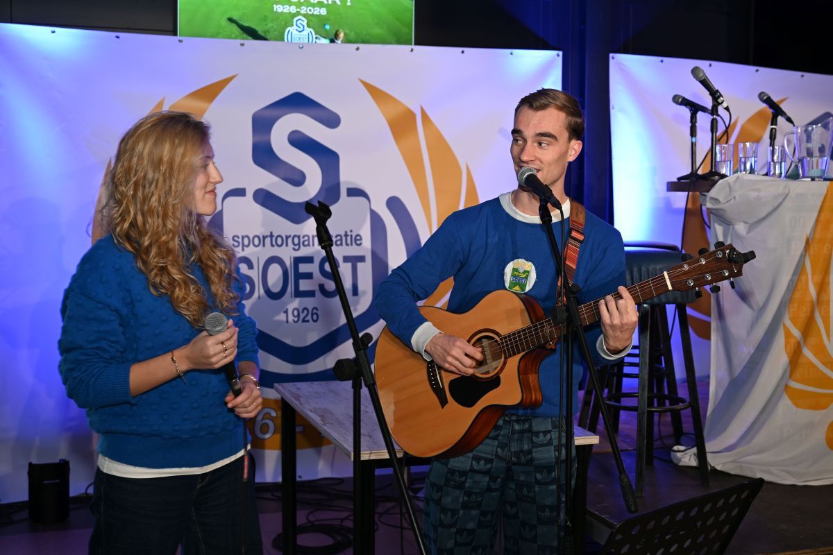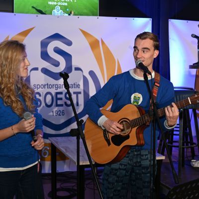 Tussen de gesprekken door verzorgden Luc (gestoken in een origineel Masita-SO Soestshirt compleet met opgenaaid logo) en Linette de muzikale omlijsting. Ze zongen na elk tafelgesprek een passend nummer en openden het programma met het clublied, a capella gezongen. Ook presenteerden ze het nieuwe Eeuwlied, speciaal voor het jubileum gemaakt, een opzwepend nummer dat straks, tijdens de festiviteiten, ongetwijfeld massaal zal worden meegezongen.