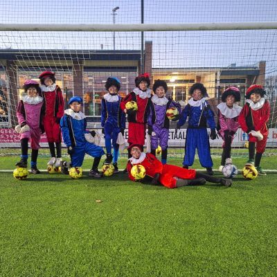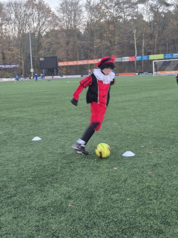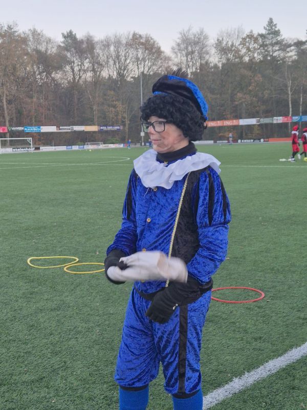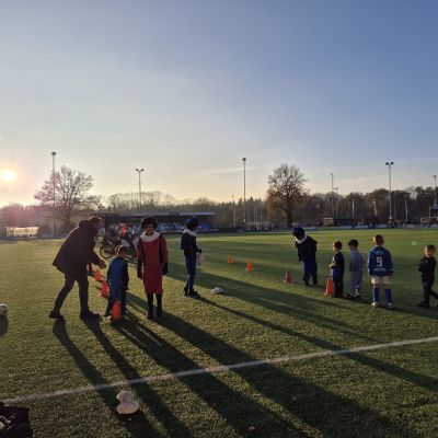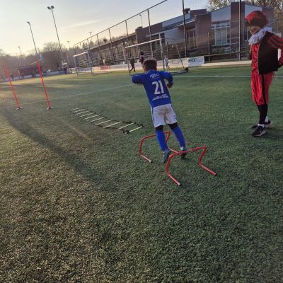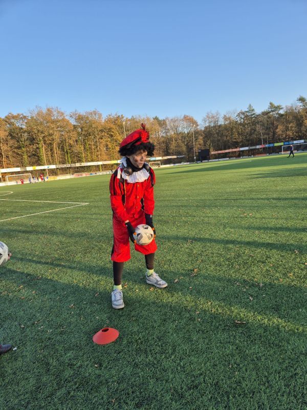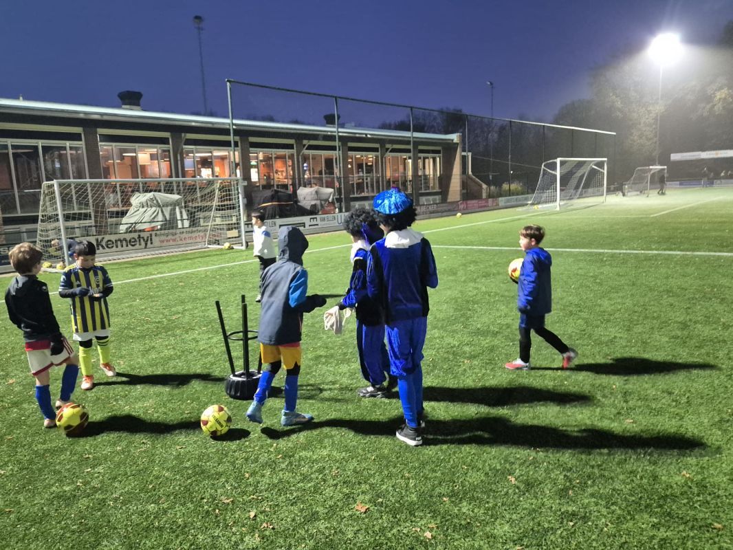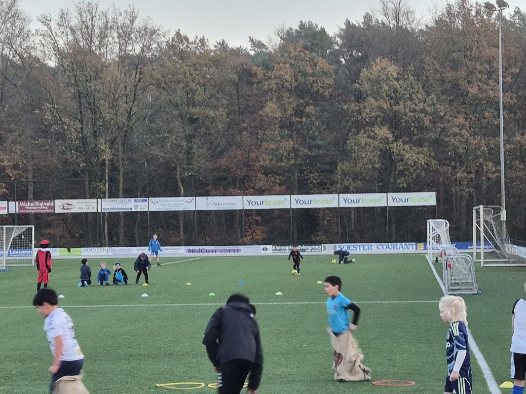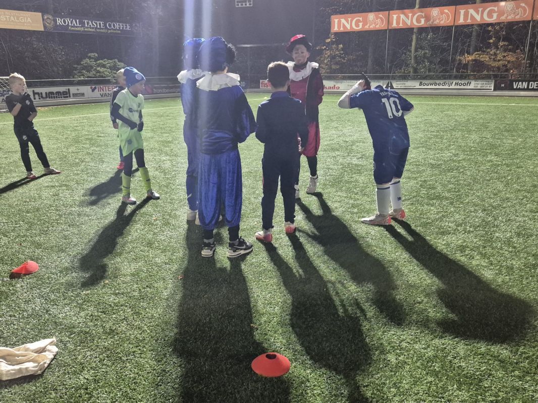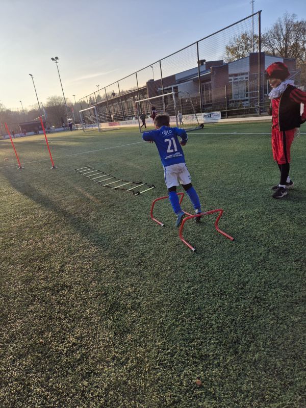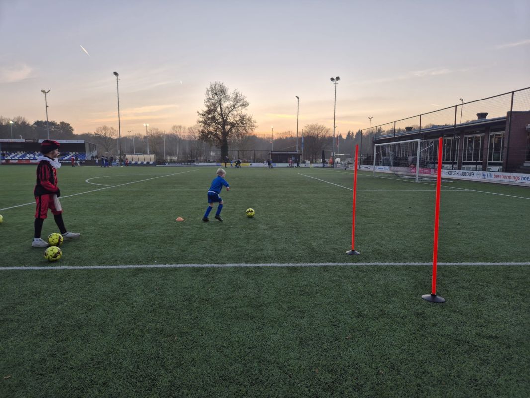 Dit jaar had Sinterklaas ook weer een hele groep kleine hulppieten meegenomen. Zij kregen van ons een korte voetbaltraining – en in ruil daarvoor gaven zij ons een echte Pieten-training, compleet met springen, rennen en slalommen.
