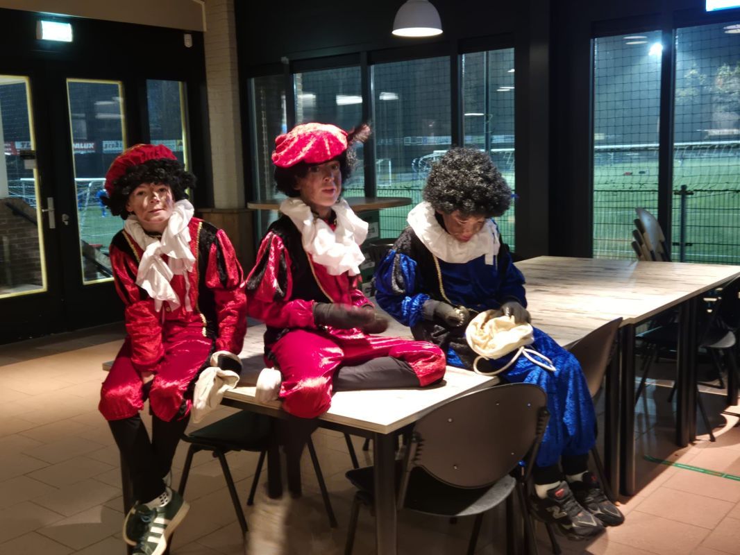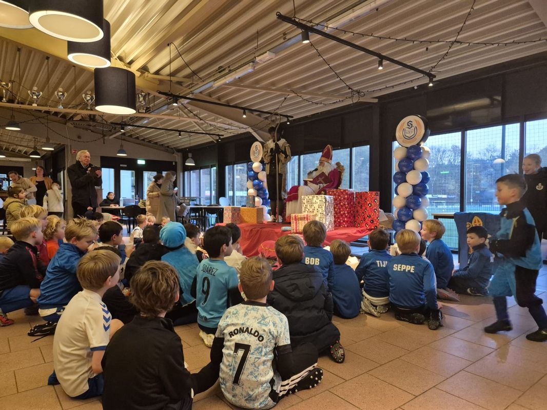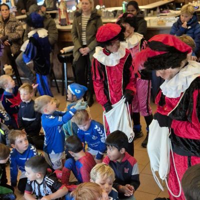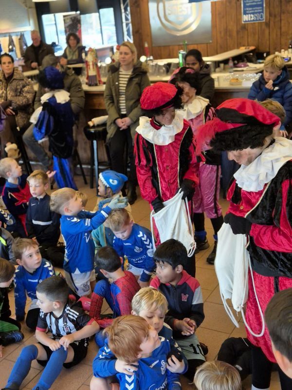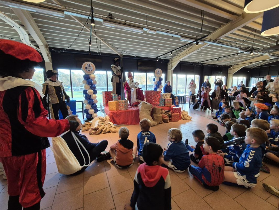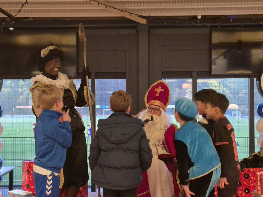 Eenmaal aangekomen werden natuurlijk eerst de trainers in het zonnetje gezet. Sint sprak zijn waardering uit voor alle inzet, enthousiasme en eindeloze energie die zij elke week in de kinderen steken. Daarna was het de beurt aan de spelers zelf. Zoals het hoort, moesten zij eerst een liedje zingen voordat er een cadeautje uit de zak tevoorschijn kwam. En hoewel de Sint zijn best deed, bleek dat hij met sommige namen nog wat moet oefenen… tot grote hilariteit van de kinderen én de Pieten.