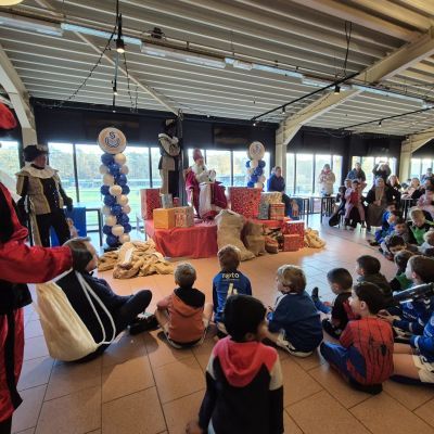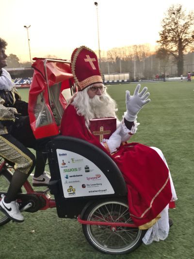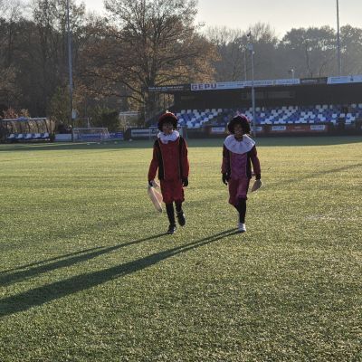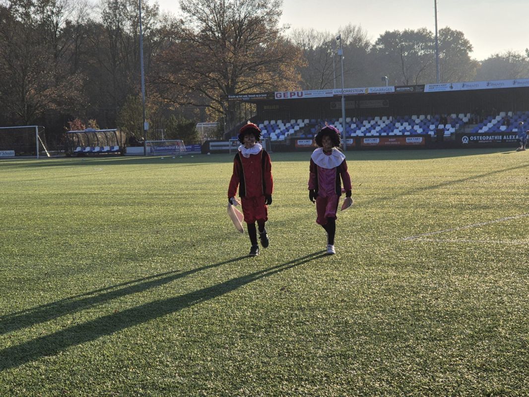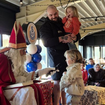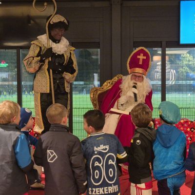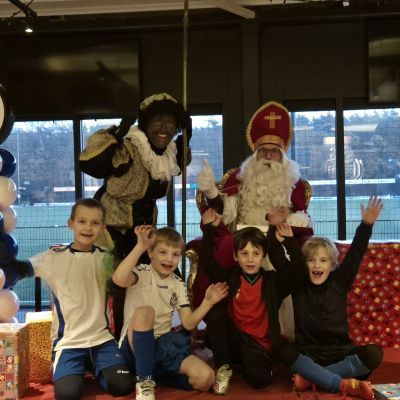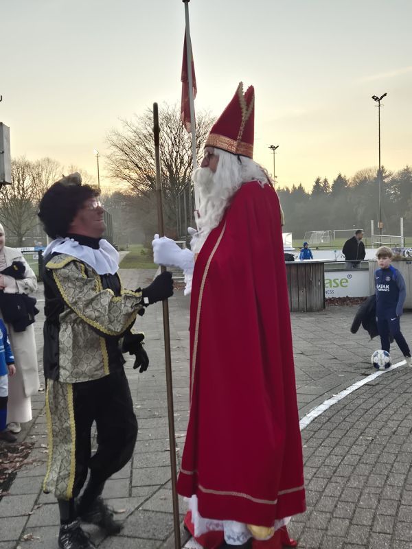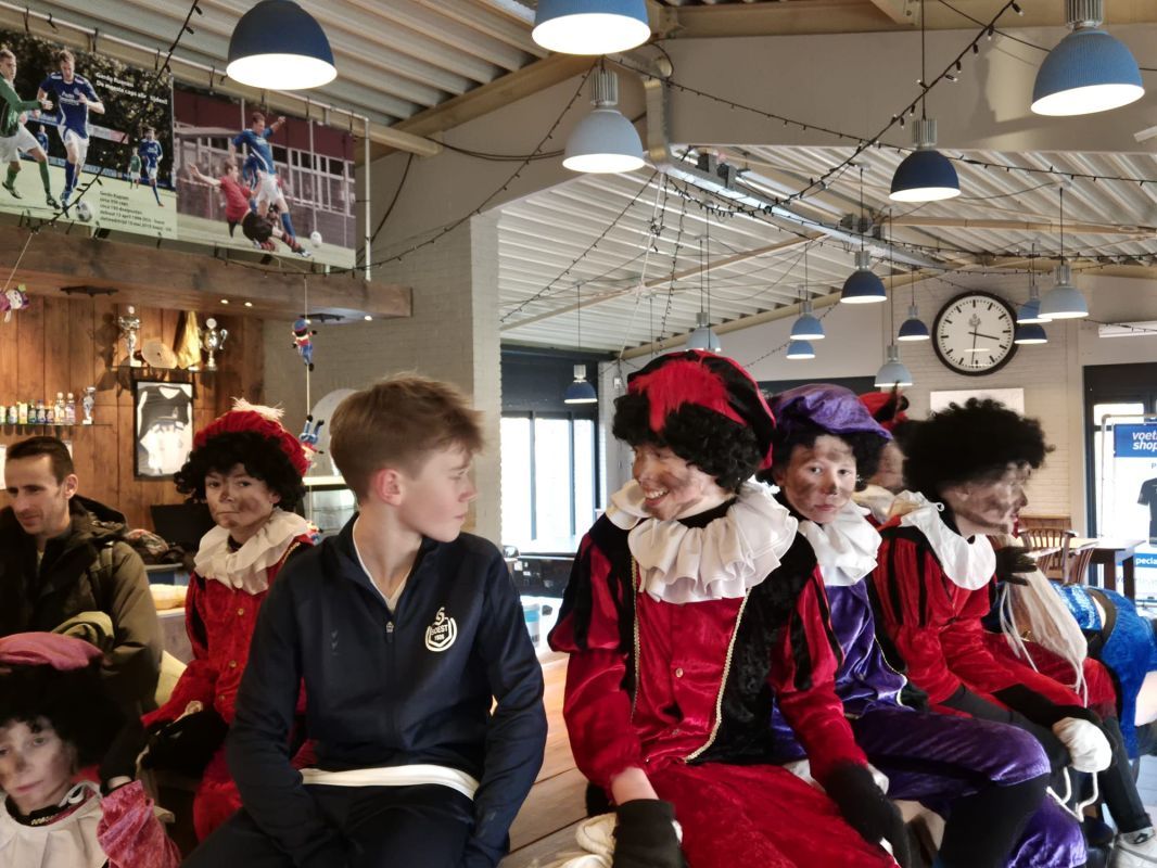 Eenmaal aangekomen werden natuurlijk eerst de trainers in het zonnetje gezet. Sint sprak zijn waardering uit voor alle inzet, enthousiasme en eindeloze energie die zij elke week in de kinderen steken. Daarna was het de beurt aan de spelers zelf. Zoals het hoort, moesten zij eerst een liedje zingen voordat er een cadeautje uit de zak tevoorschijn kwam. En hoewel de Sint zijn best deed, bleek dat hij met sommige namen nog wat moet oefenen… tot grote hilariteit van de kinderen én de Pieten.