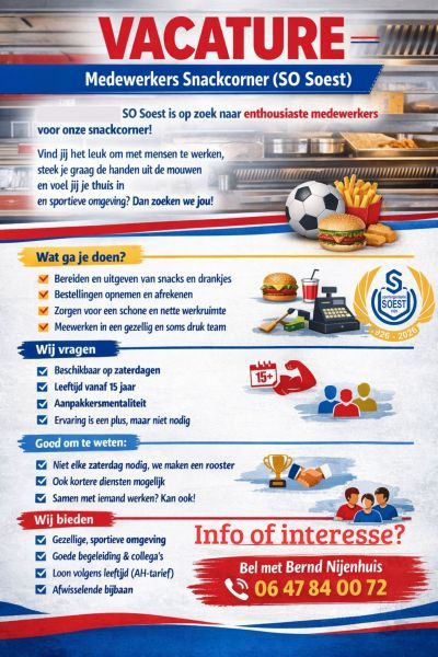 SO Soest is op zoek naar enthousiaste medewerkers voor onze snackcorner. Vind jij het leuk om met mensen te werken, steek je graag de handen uit de mouwen en voel jij je thuis in een sportieve omgeving? Dan zoeken we jou!