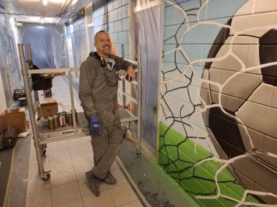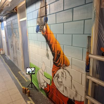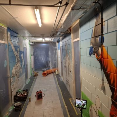 De gang bij de kleedkamers ondergaat momenteel een metamorfose waar iedereen jaloers op zou zijn. Graffiti, kleur, karakter – en dat alles met een uitstraling die je niet zomaar even wegpoetst.