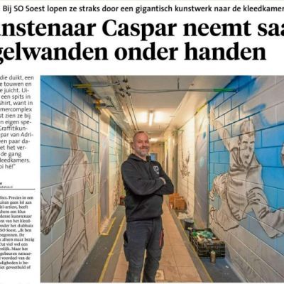 Voor deze opdracht is graffiti-kunstenaar Caspar van Adrichem, bekend onze zijn 'artiestennaam' Caspar Cruse, aangetrokken. Hij is 6 januari begonnen en het werk vordert gestaag. Onze fotograaf nam vrijdagochtend al een kijkje en Gooi & Eemlander-journalist Eric Lorier was er al een dag eerder voor een paginagroot artikel dat je via onderstaande knop kunt downloaden.