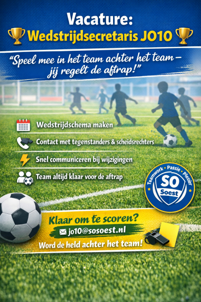 Bij SO Soest draait het om passie, plezier en teamwork. Voor onze JO10-teams zoeken we een Wedstrijdsecretaris die zorgt dat elke wedstrijd een succes wordt – van planning tot fluitsignaal.