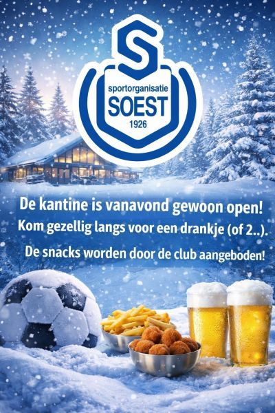 Ondanks het afgelasten van de trainingen is de kantine donderdagavond (29 januari) open. Kom gezellig een drankje halen. De snacks worden door de club aangeboden. Het scherm staat aan, dus voetbal kijken kan uiteraard ook.