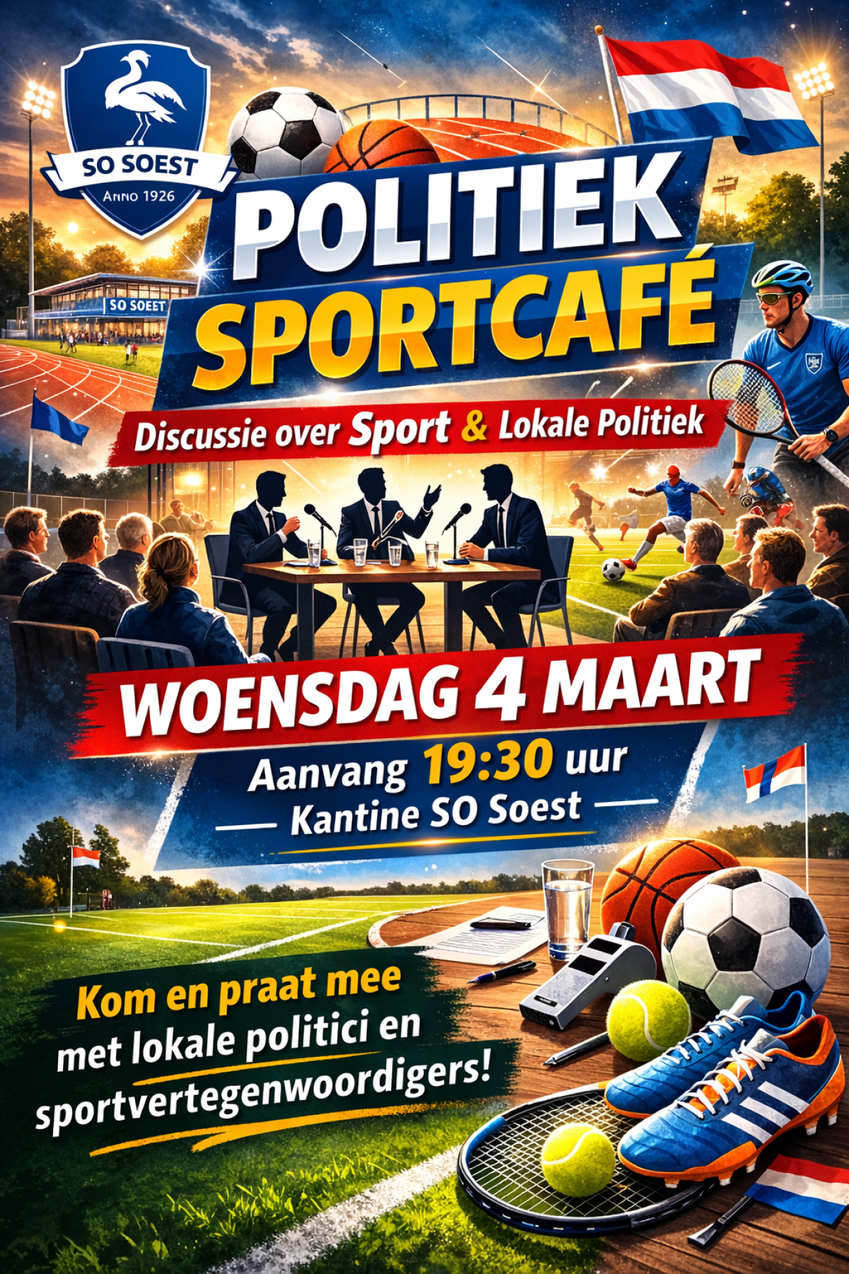 Sportfederatie Soest en Lokaal Sport- en Beweegakkoord Soest organiseren het Politiek Sportcafé Soest op 4 maart van 19:30 - 21:00 uur bij SO Soest.
