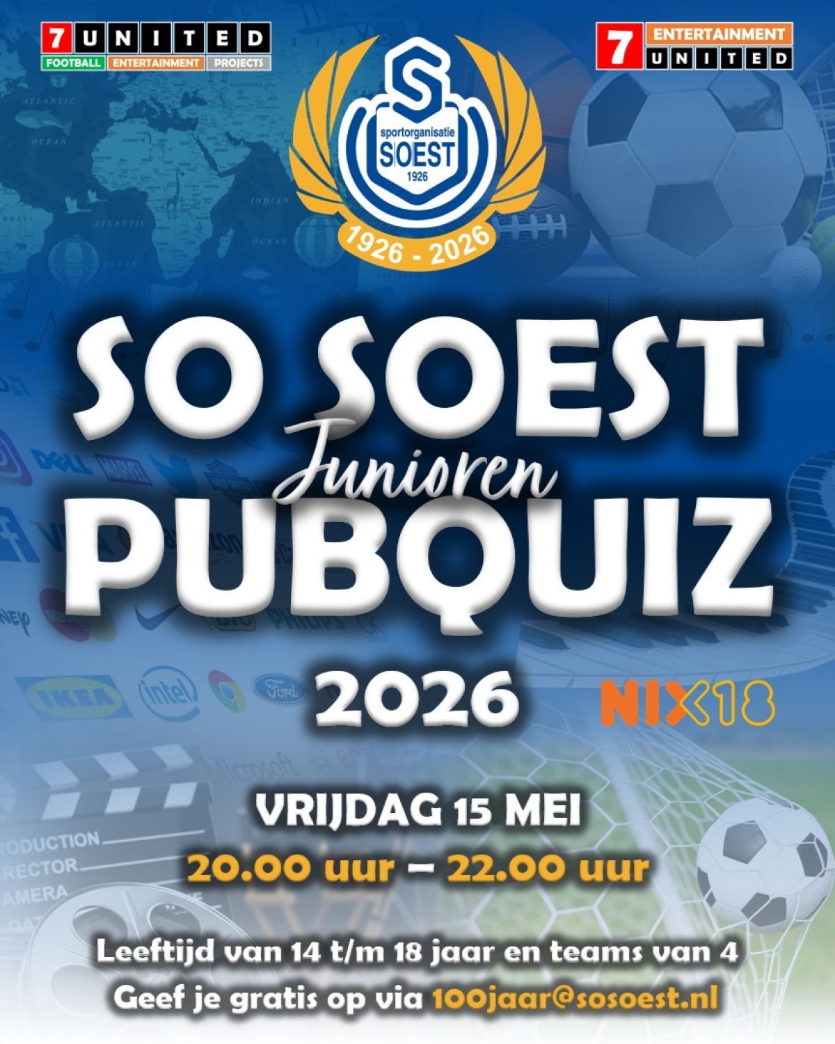 Doe mee met een team van 4 personen en ga voor de leukste prijzen. Deelname is gratis, maar wel even aanmelden. Vrijdag 15 mei voor de SO Soest-jeugd van 14 tot en met 18 jaar. Presentatie en samenstelling is van Rick Andeweg van 7United Entertainment. Meld je aan via 100jaar@sosoest.nl