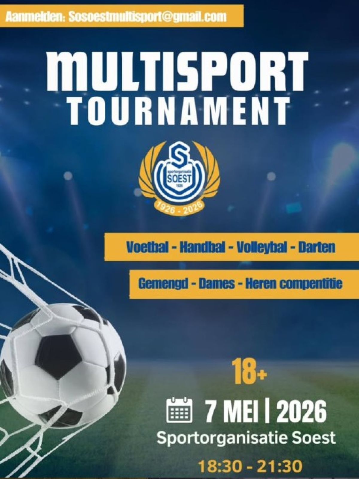 Ter ere van het 100-jarig bestaan van SO Soest organiseren we op donderdag 7 mei een gezellige multisportavond! Stel je team samen en doe mee aan een sportieve avond vol competitie, gezelligheid en een goed feestje achteraf ![]()