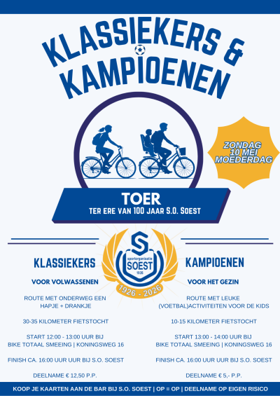 Op zondag 10 mei staat alles in het teken van samen genieten. Ter ere van het 100-jarig jubileum organiseert SO Soest een bijzondere Moederdag Fietstocht voor jong en oud. Een dag vol beweging, gezelligheid en mooie momenten met elkaar.