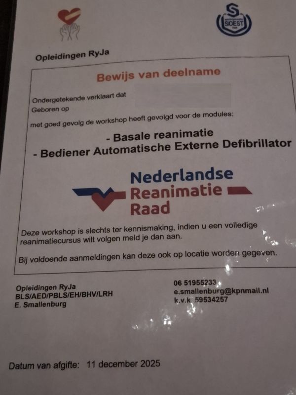 Donderdagavond werd er, op initiatief van Charles Roest, een feestje gevierd in ons clubhuis. Na de oefenwedstrijd van SO Soest 1 tegen Valleivogels (2-1), werden in de kantine de certificaten uitgereikt aan de deelnemers van de reanimatiecursus. Jade Linders behaalde de hoogste score en kreeg de spotlights en het podium.