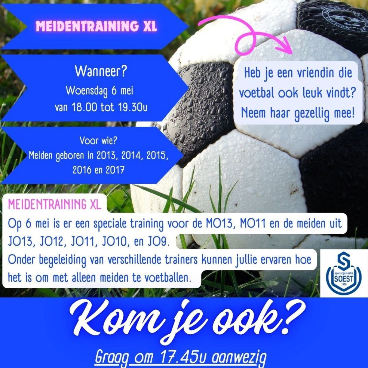 Ben jij een meisje, geboren in 2013, 2014, 2015, 2016 of 2017 en wil je weten hoe het is om met andere meiden te voetballen? Kom dan meetrainen op woensdag 6 mei.