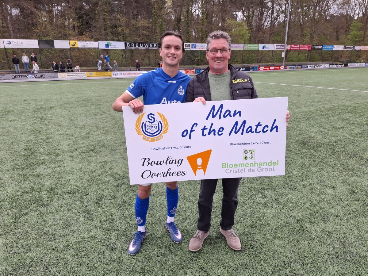 Koen van Logtestijn was zaterdag een van de uitblinkers bij de wedstrijd van SO Soest tegen HVC. De handige rechtsbuiten flitste een aantal keer langs zijn tegenstander en was voortdurend aanspeelbaar. Jurylid Harry Janmaat overhandigde aan Koen de bon voor Bowling Overhees en de bloemenbon voor Cristel de Groot.