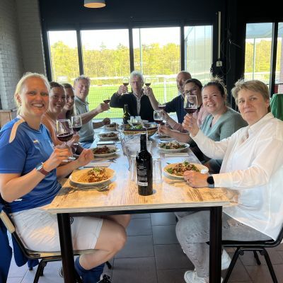 De oud-penningmeester van onze club verzorgde een zeer voedzame, maar vooral erg smaakvolle maaltijd. Inclusief toetje! Geheel tegen de principes in werd er al een wijntje genuttigd voor de training. Maar de verleiding was gewoon niet te weerstaan. De dames waande zich in een sterrentent met top eten en top bediening! Dank je wel René Musolf!