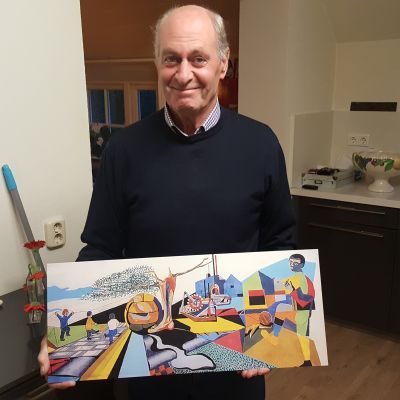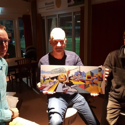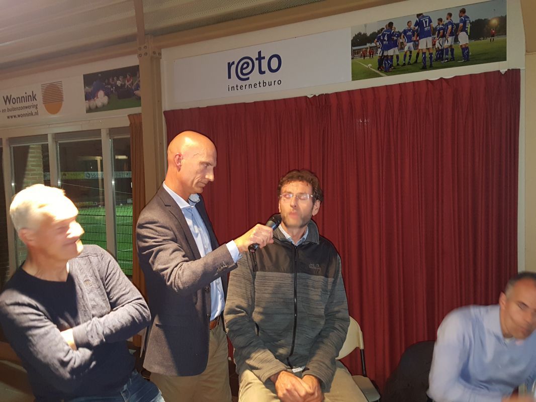 Een aantal leden van het eerste uur worden door André Hooft en Peter Beijer toegesproken. Minimaal vijftig jaar actief zijn Wilfred Janmaat, Peter Hilhorst, Frank Smits, Wim Kok en Gerard Beijer. De mannen voetballen nog steeds en aan de hand van enkele dia's werd gevraagd naar hun ervaringen uit het verleden. Peter en Gerard konden niet aanwezig zijn, maar een dezer dagen ontvangen zij, net als Wilfred, Frank en Wim een mooie plaat van de authentieke tekening van Otto Prinsen die jarenlang ons oude clubhuis heeft gesierd.