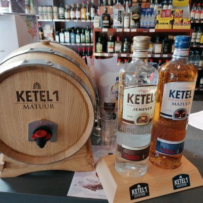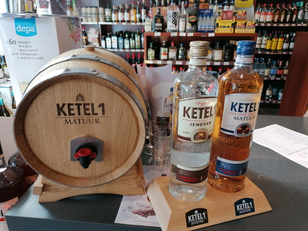 Rob wenkt ons en laat de aanbieding zien die naast de kassa is opgesteld. De Ketel 1. Rob vertelt: ,,De Ketel 1 ontleent zijn naam aan de oudste, actieve distilleerketel van Schiedam, ketel nummer 1. Hoewel er weinig bekend is over het, geheime, recept van Ketel 1 Graanjenever weten we wel dat er gebruik wordt gemaakt van topkwaliteit ingrediënten. Ketel 1 drinkt lekker zacht weg. Naast zacht is het ook een zeer zuivere jenever. Een must voor elke liefhebber!”