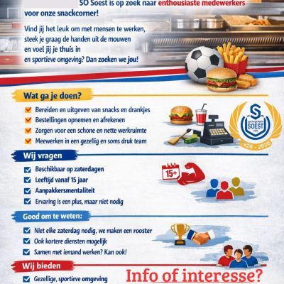 SO Soest is op zoek naar enthousiaste medewerkers voor onze snackcorner. Vind jij het leuk om met mensen te werken, steek je graag de handen uit de...