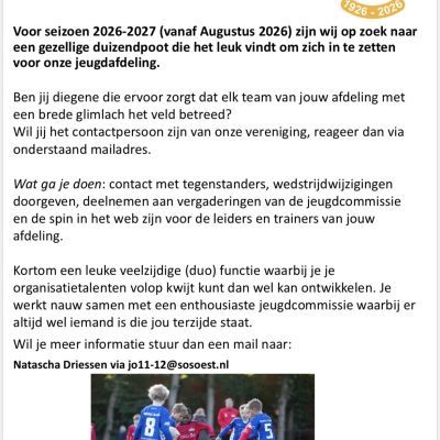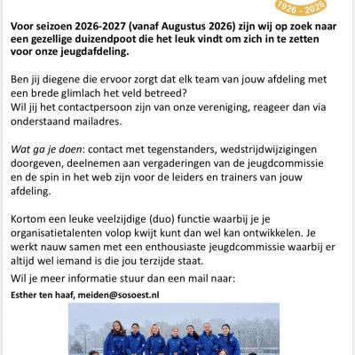 Gezocht: wedstrijdsecretaris MO11-13-15-17-20. Meer info zie deze flyer of Esther ten Haaf meiden@sosoest.nl